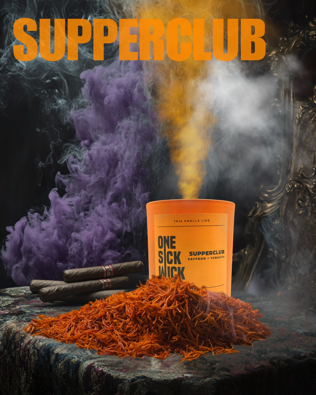 Our irresistible Supperclub candle fragrance - perfect for those who love to throw the classiest dinner parties or for those nights when takeout just ain’t gonna cut it. With the rich aromas of saffron and tobacco infused with the sweet scents white tea and purple peonies, this candle is like a chefs special recipe that will transport you straight to a luxurious supper club feast. And If that’s not enough to make you feel fancy, the subtle notes of vanilla and almond milk will have you sipping your earl grey with your pinky up. As you light up this bright orange vessel, you can almost hear the clinking of wine glasses (or tea cups). And because we don’t do things halfway, this candle will set the mood with just the right amount of sass and style. So, light up “supper club” and let the good times (and good smells) roll.